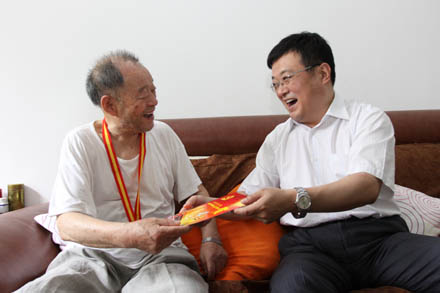 集團(tuán)公司總經(jīng)理王謙在集團(tuán)公司老干部工作部人員的陪同下來到離休老黨員姜功同家里,王總親自把集團(tuán)公司頒發(fā)的獎(jiǎng)?wù)陆o姜老戴上,宣讀了中央組織部的慰問信和山東省委的賀卡,并邀請(qǐng)姜老積極為企業(yè)的發(fā)展獻(xiàn)計(jì)獻(xiàn)策。姜老感謝集團(tuán)公司多年來的關(guān)心,并表示將繼續(xù)發(fā)揮余熱,為企業(yè)的發(fā)展再立新功。