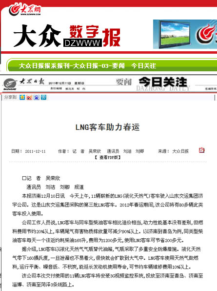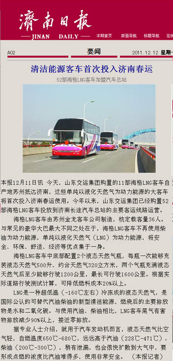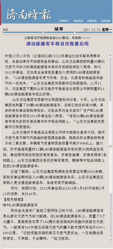 在采訪活動中,采訪團深入蘇州金龍客車制造車間,觀看了車輛從車架組裝、整車陰極電泳到制動配制等流水制造的全過程,體驗了客車制造的嚴密工序;在金龍客車廠產(chǎn)品展室,記者們了解了蘇州金龍客車廠的發(fā)展歷史及企業(yè)安全文化,對燃氣清潔能源客車所應(yīng)用的新技術(shù)、新工藝、新材料有了更進一步的認識;在蘇州金龍客車廠會議室,總工程師張衛(wèi)林將燃氣清潔能源客車與汽油、柴油等能源客車進行比對,向記者詳細介紹了燃氣清潔能源環(huán)保客車在安全、環(huán)保、節(jié)能等方面的優(yōu)勢;在“山東交運集團清潔能源環(huán)保客車交車儀式”上,各新聞媒體記者又對本次燃氣清潔能源環(huán)保客車車輛安全運營、節(jié)能減排、線路投放等情況,進行了現(xiàn)場采訪和隨行拍攝。12月9日晚22點,集團公司燃氣清潔能源環(huán)保客車車隊經(jīng)一路跋涉平安抵濟,12月10日晚,省電視臺山東衛(wèi)視頻道在《新聞聯(lián)播》欄目、濟南市電視臺濟南新聞頻道在《濟南新聞》欄目以及《大眾日報》、《齊魯晚報》、《山東商報》、《生活日報》、《現(xiàn)代交通報》、《濟南日報》、《濟南時報》、《交通廣播》等媒體都對集團公司燃氣清潔能源環(huán)保客車投入春運情況進行了重點報道。