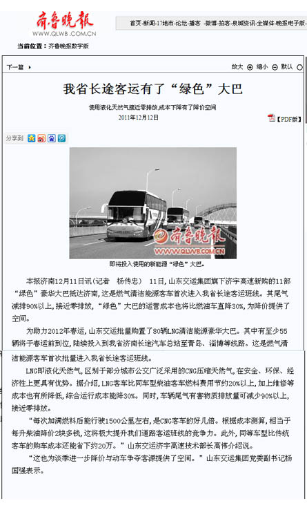 長期以來,集團公司高度重視節(jié)能減排工作,積極利用培訓(xùn)、比賽等方式,解析節(jié)能方法,測定油耗標準,推動節(jié)能減排工作深入開展。本次集團公司濟宇高速新購進11輛燃氣清潔能源環(huán)保客車,是集團公司調(diào)整車輛結(jié)構(gòu),優(yōu)化運輸組織,提高企業(yè)核心競爭力、創(chuàng)建節(jié)約型企業(yè)的戰(zhàn)略任務(wù)之一。是進一步貫徹“兩保兩樹”和“對標·精細化管理增效年”、“創(chuàng)先爭優(yōu),爭做交運先鋒”活動的重要載體,為積極做好本次接車新聞宣傳工作,集團公司早部署早發(fā)動,認真組織全面策劃,收集素材擬寫新聞通稿,多方聯(lián)系溝通協(xié)調(diào)。12月6日,集團公司黨委副書記楊國強帶領(lǐng)山東電視臺、濟南電視臺、《大眾日報》、《齊魯晚報》、《現(xiàn)代交通報》、《濟南日報》、《濟南時報》、《交通廣播》等8家新聞媒體,以及黨委組宣部、濟宇高速相關(guān)工作人員,前往蘇州金龍客車廠,以“山東交運集團80余部燃氣清潔能源環(huán)保客車助力春運”為主題,進行了全面深入的聯(lián)合新聞采訪。