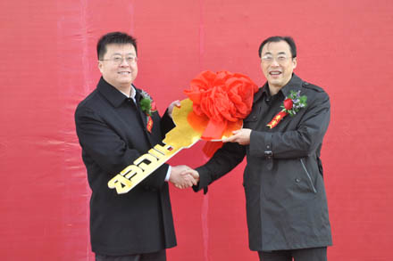 山東省交通運輸集團有限公司黨委副書記楊國強(左)和江蘇金龍客車有限公司黨委書記、新能源客車公司總經(jīng)理謝飛鳴在交接現(xiàn)場。